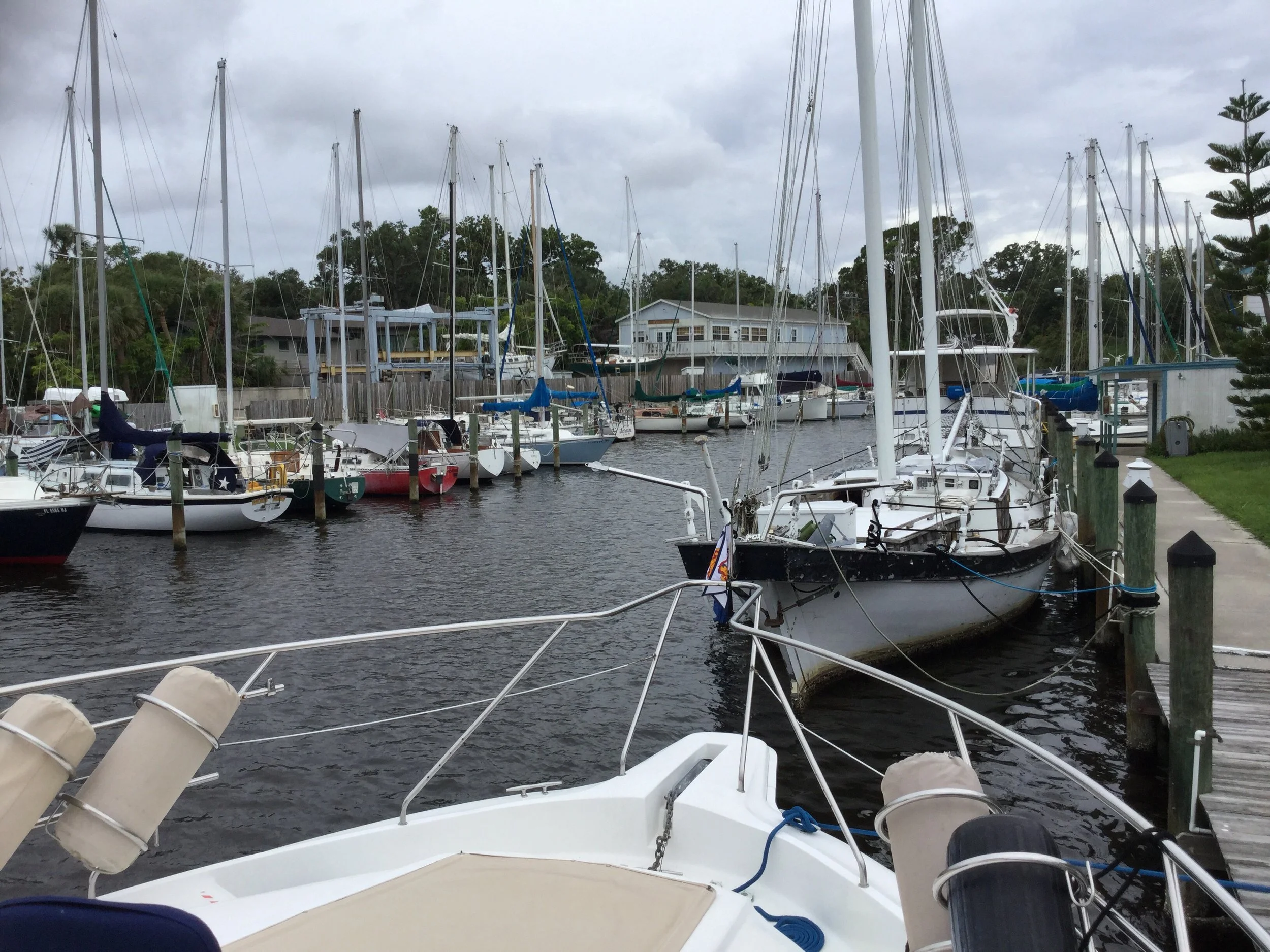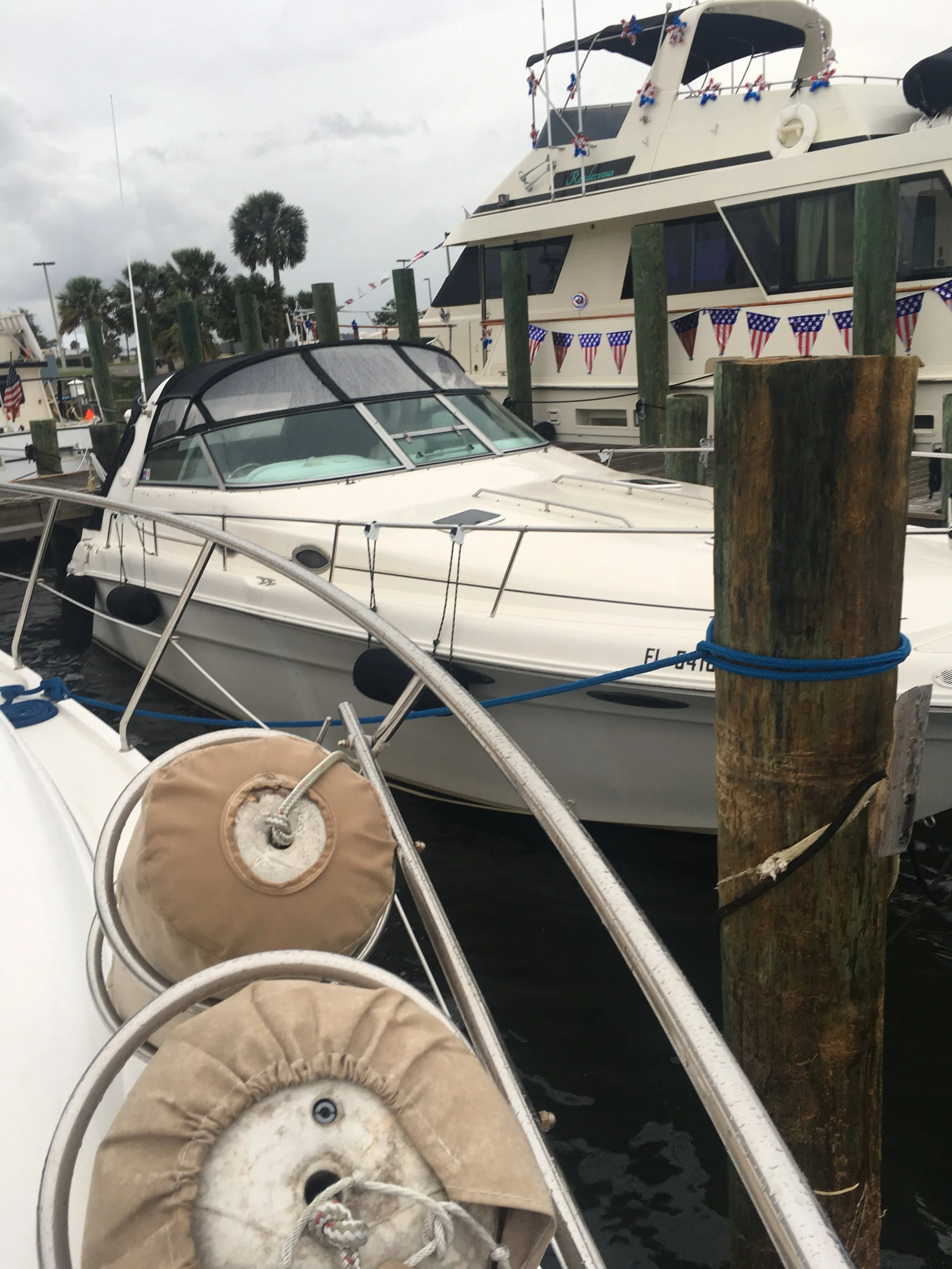 Today is Saturday. There is a tropical storm brewing in Florida. We have been ahead of this storm since we left. It is supposed to catch up with us tonight and tomorrow it is supposed to pour. We are safe in a slip at the Titusville Marina and we will stay put here again tomorrow if need be. We are just North of Cape Canaveral. I took a few pictures as we passed, but they didn’t turn out to well. But, it was pretty cool to see it there in our distance.