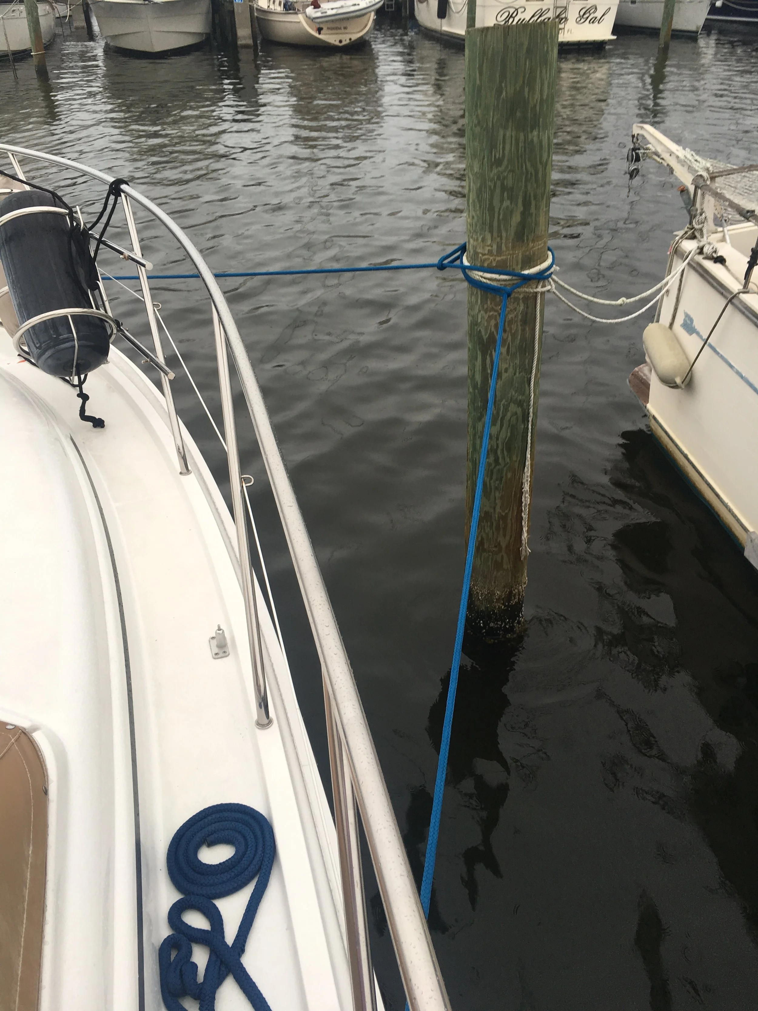 After the engine room is cleared, we then have to pull and store our electrical cord, fill our water tank, and prepare for departure. We are leaving from a marina where we have been tied up to pilings, which have kept us secure over night. Our lines are 35 feet long on the port and starboard sides and our stern lines are 50 feet long. All of these must be taken off, and then we can go! While Jim drives away, I secure all the lines and stow them away until we need them again.