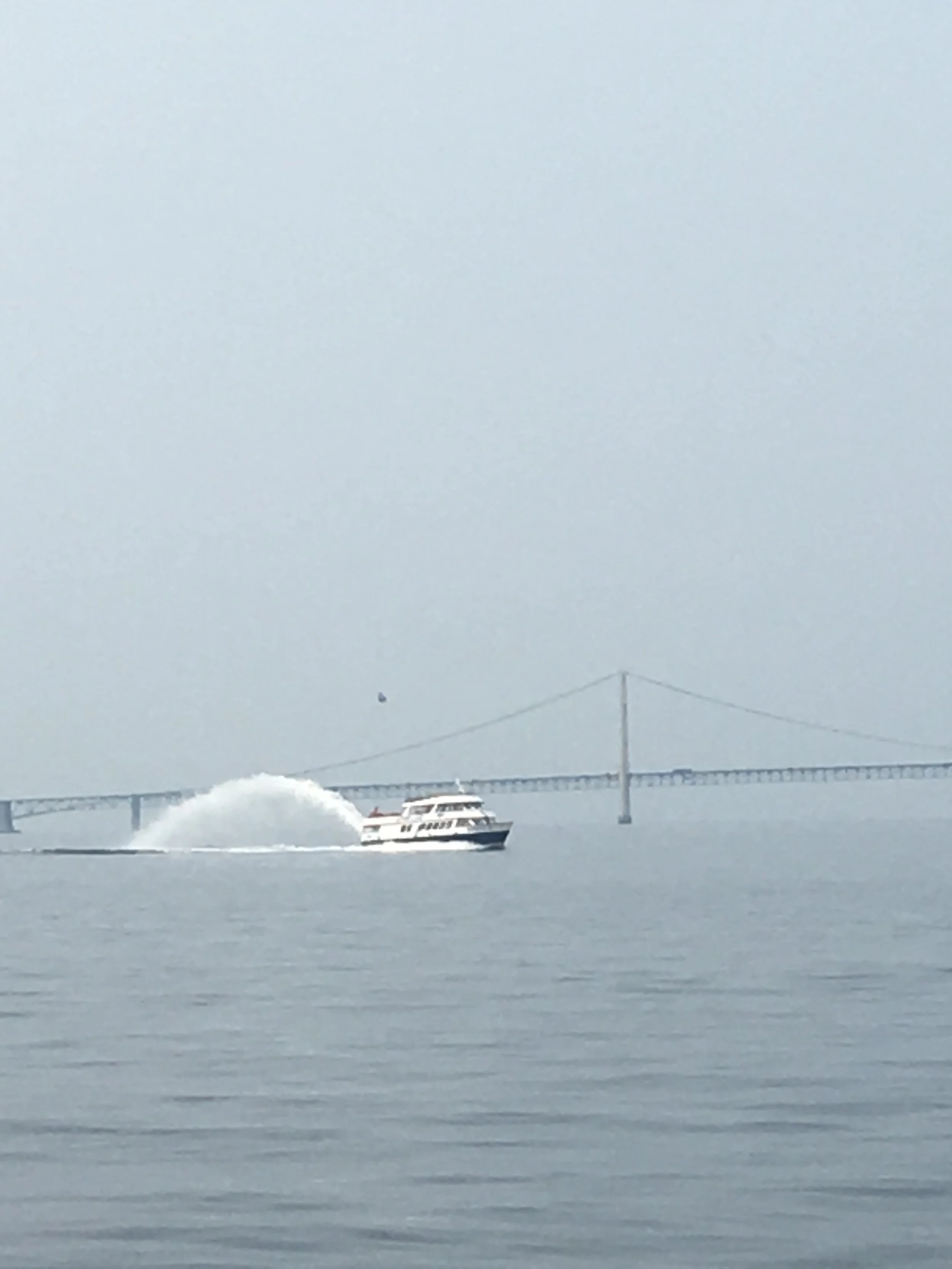 Wednesday, the 15th, took us under the Mackinac Bridge and into Great Lake Michigan. A new lake to jump in! Our friends that we met way back in Deleware City, Keith and Kay, on Sea Tiger, were traveling on this day too. They shot this picture and sent it to me.