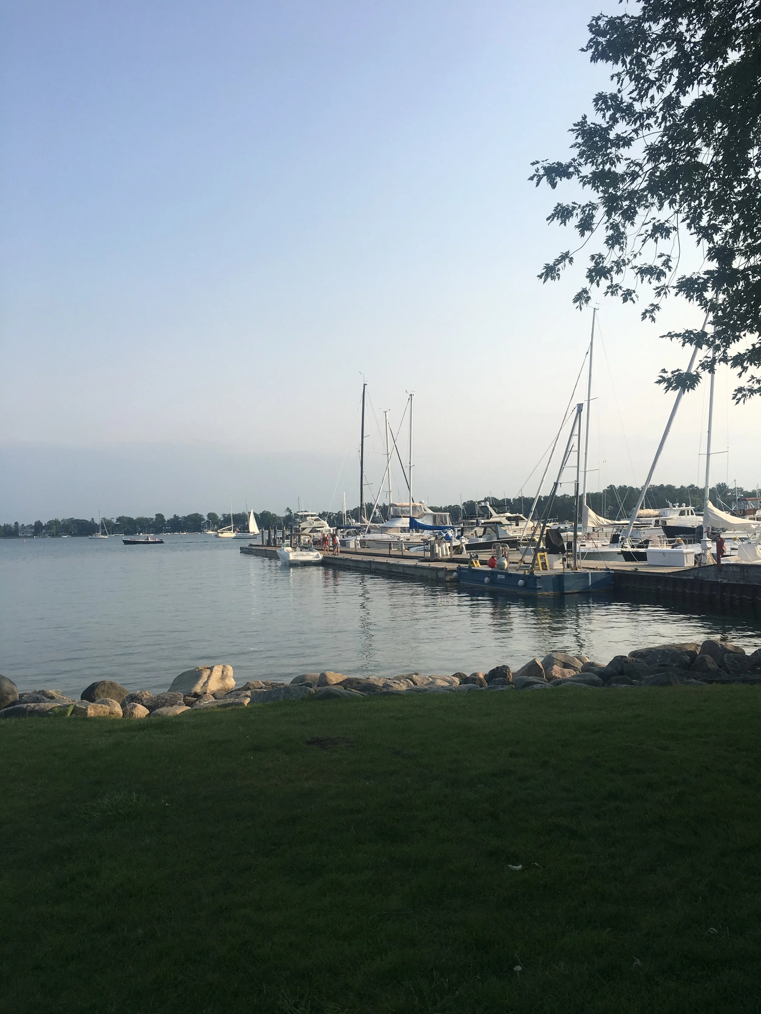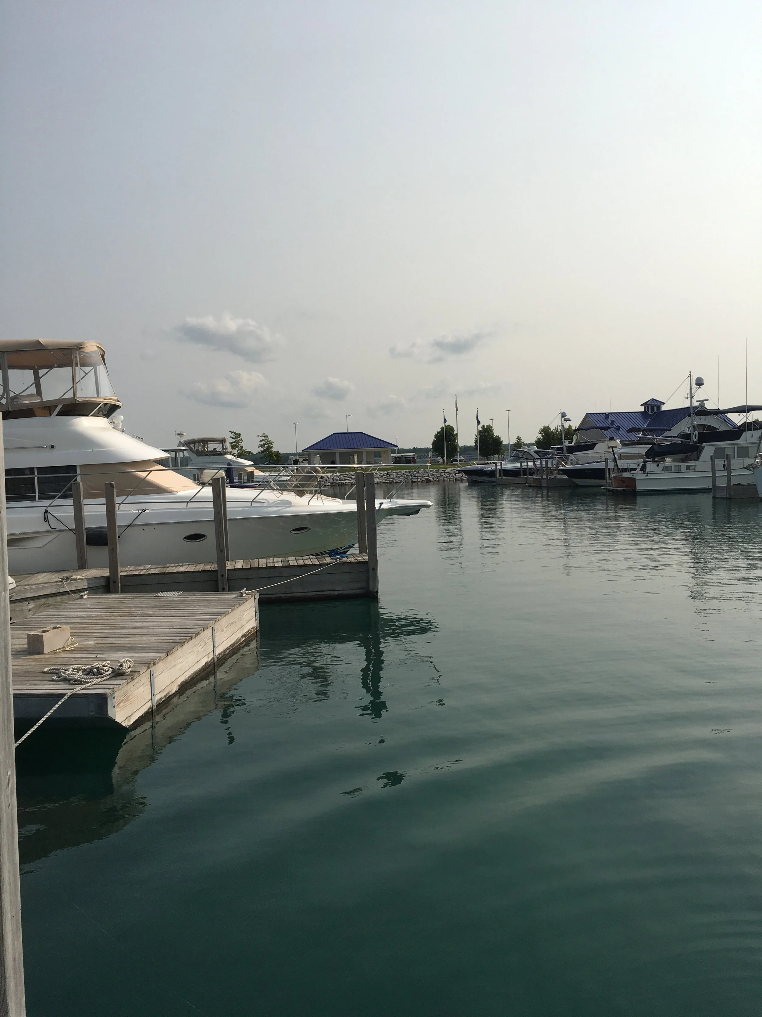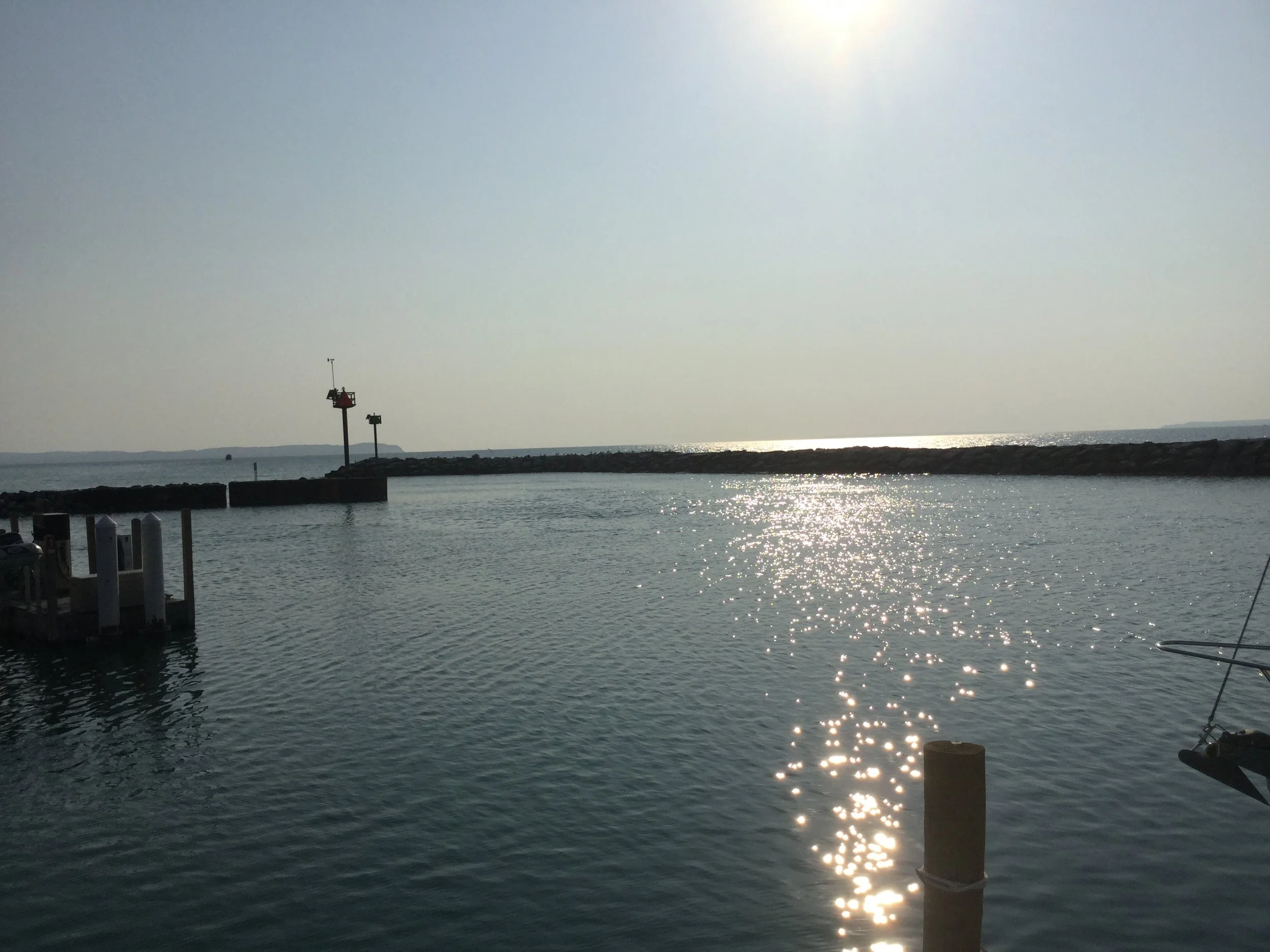 We had a 52 mile crossing and arrived in Harbor Springs, Michigan. As I write, we are at Irish Boat Works Marina and enjoying our time here. We went to a meeting last night at the City Hall. Again, always good to get to a meeting. Restores my faith, and feels like home. Harbor Springs is a gorgeous community. Beautiful homes and great shops. I went to the city beach today and relaxed while Jim did some boat maintenance and took care of some paperwork. When I returned, I tackled some work of my own. The forward berth of the boat is an area in our boat where we store the things we couldn’t live without when we left California. I store things on the bed and cover said things, with pillows. It’s not that much stuff, but it was time to go through it and throw some things away that we just don’t need or use. I’ve come to find out that I probably brought too many clothes, and I definitely have too many hangers. We chucked a small table, some old maps, a few pan lids, and a whole bunch of papers from the previous boat owner. It felt good to downsize one more time. It is a good day when you know that you just don’t need a whole bunch of stuff cluttering up your life.