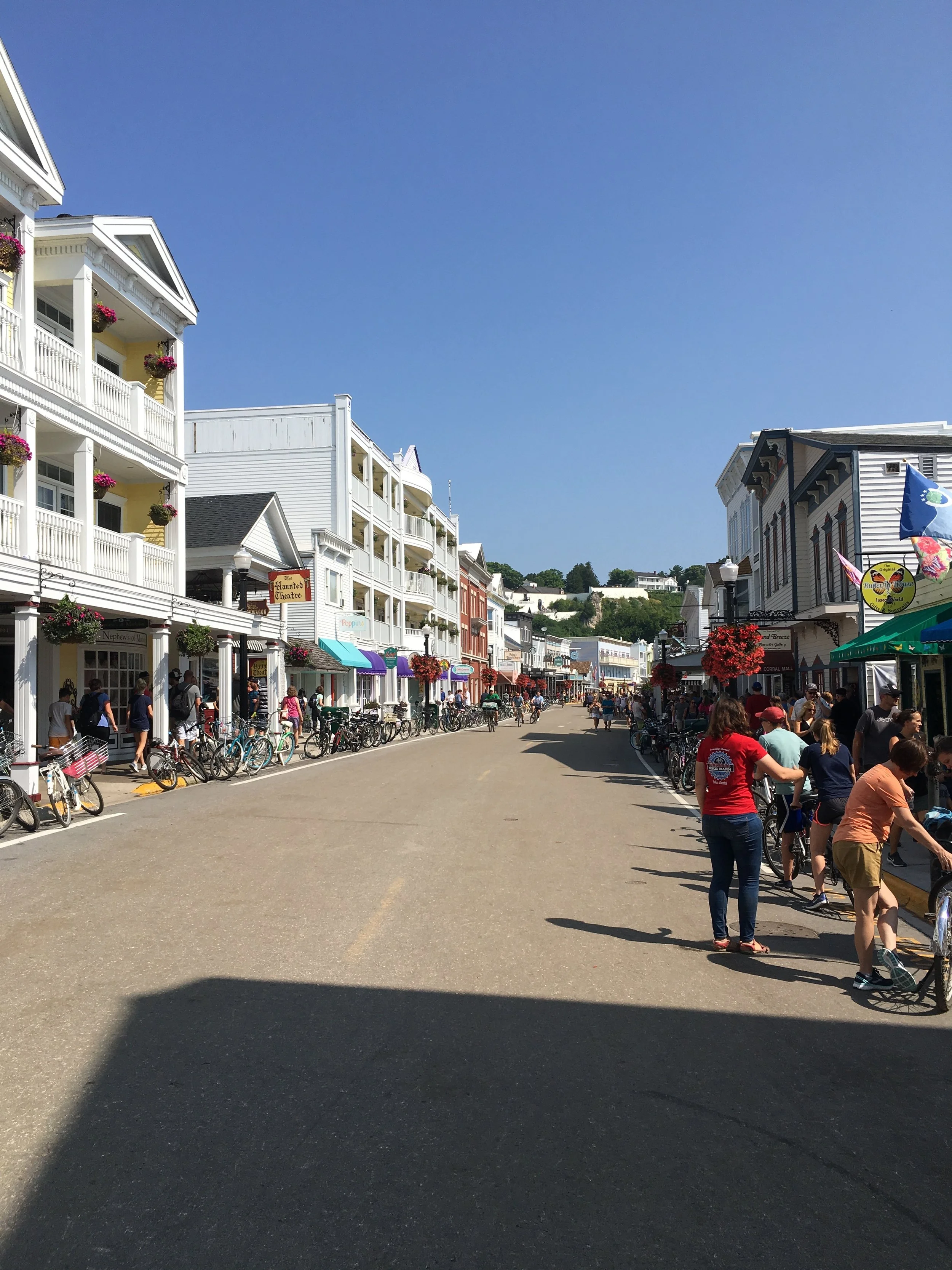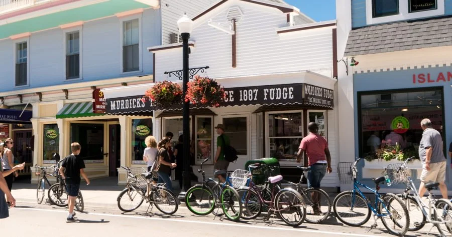 The town of Mackinaw City is adorable. Jim had been thwarting off his compulsion to buy fudge in Canada until we arrived here in Mackinaw. This city and it’s Island is world famous for its fudge and other confections. There is a fudge shop at every other storefront here. As we walked the street, the sweet smell of chocolates and popcorn filled the air. Jim picked the store we were to buy our fudge from, by the smell omitting from the front door. Joann’s Fudge Shop, was the store we bought Jim his Mackinaw fudge.