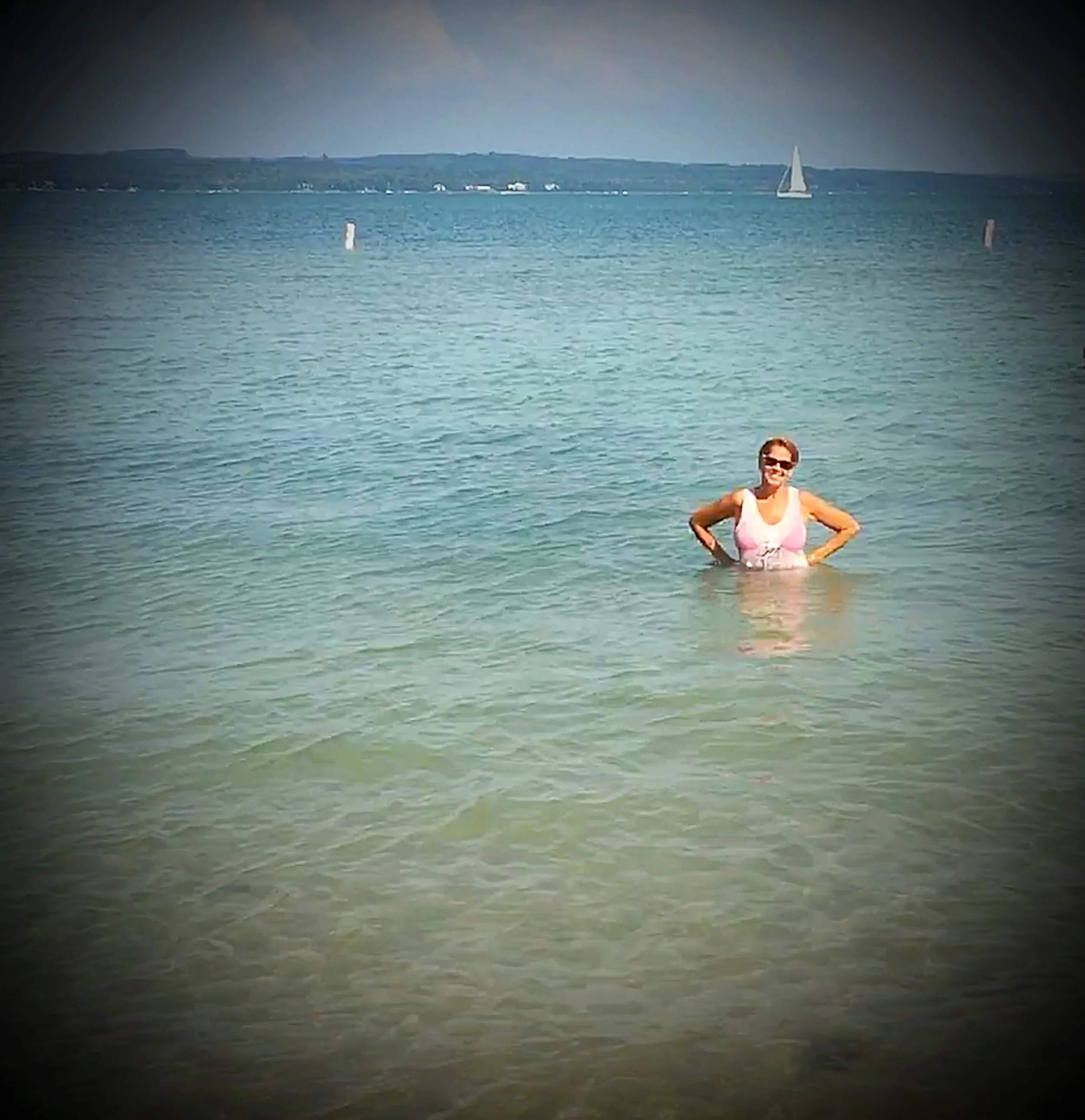 We had to wait a few minutes for the bridge opening. Once we went through, we were in Charlevoix Lake. We got settled in the marina, took the dingy to the office to pay, and I went to the beach, which was a 5 minute walk. Sandy, a looper friend joined me and we both cooled off in the lake. It was so nice and refreshing!
