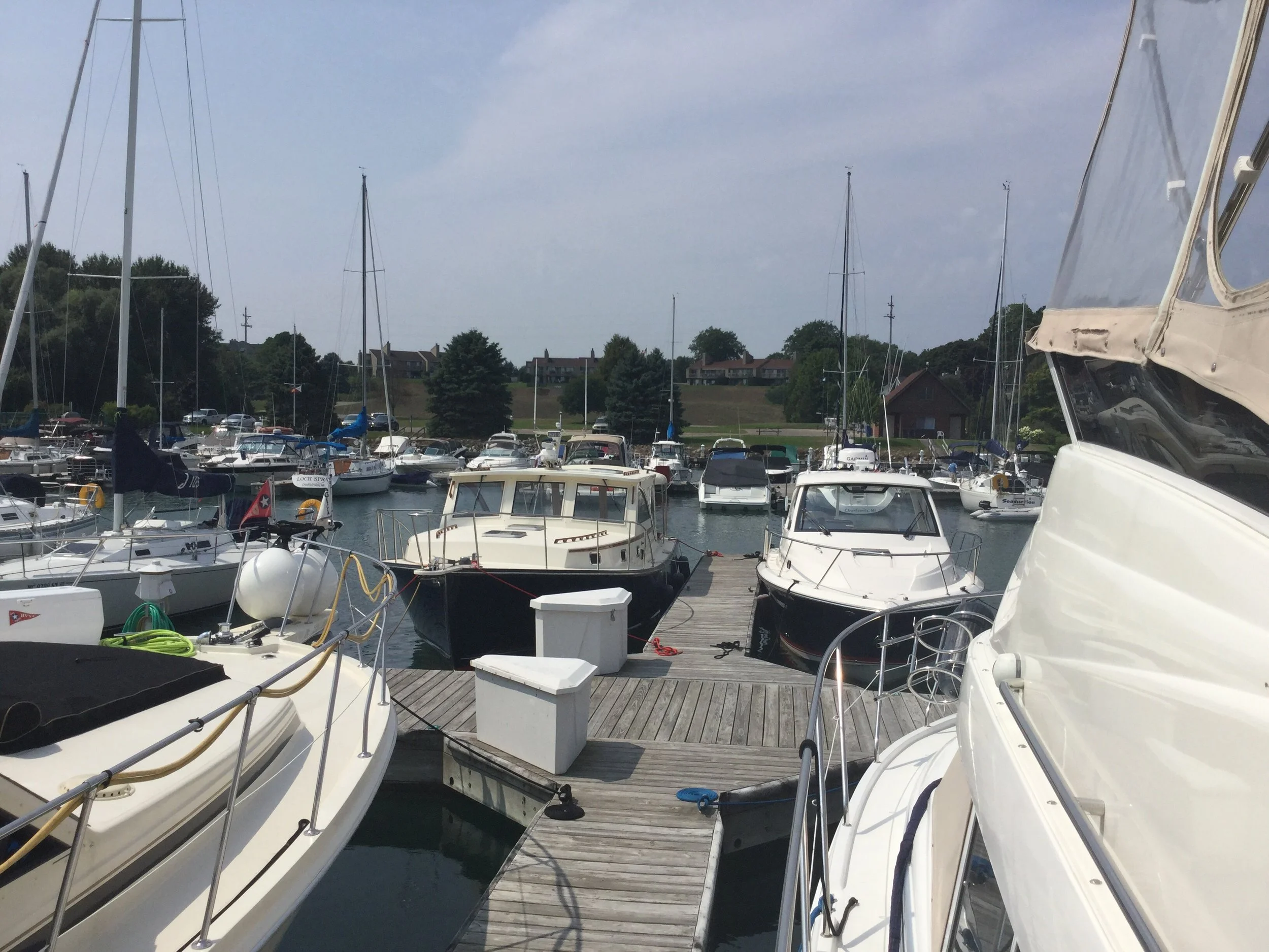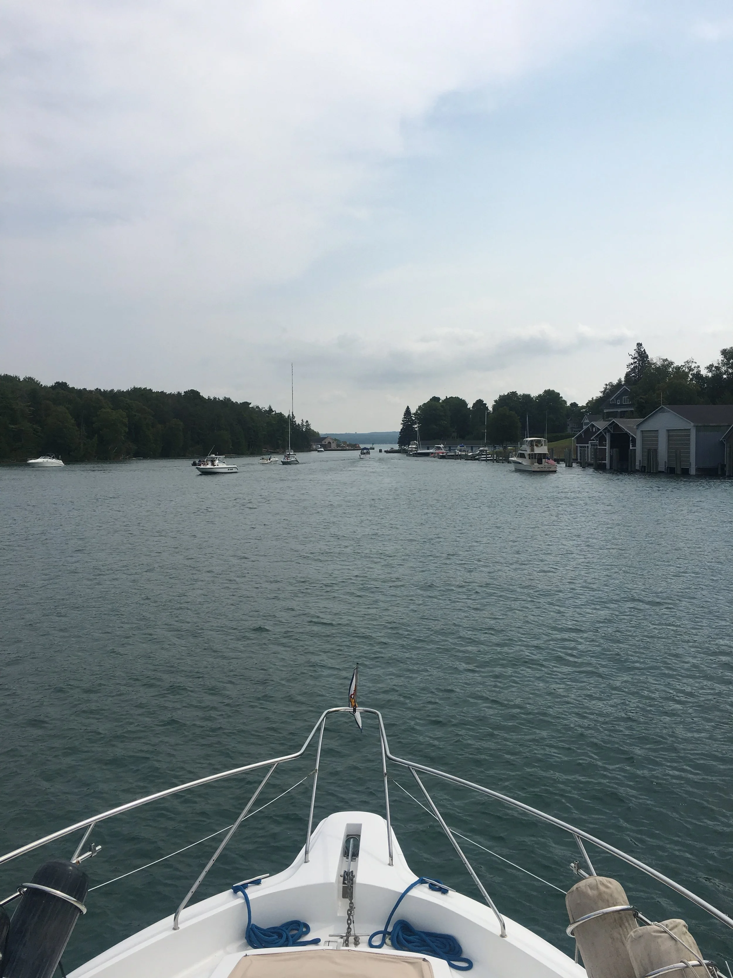 We cleared customs in De Tour Village, Michigan. A tiny little town, that only had a few homes and one grocery market that was closed at 3:00 in the afternoon. Checking in with customs was much easier here than back in Kingston. There’s actually an app called ROAM, that we used. We filled in our information right on Jim’s IPad, submitted the information, and 10 minutes later a Customs Agent called us and did a phone interview right on the boat. Easy, peasy. She welcomed us home and I think both Jim and I were relieved that we made it through 28 days in Canada with only two marks on our boat. One, where we scraped the stern on a lock wall in the wind, and two, where Jim punched a small hole in the fiberglass with a boat hook in a lock. God damn locks!