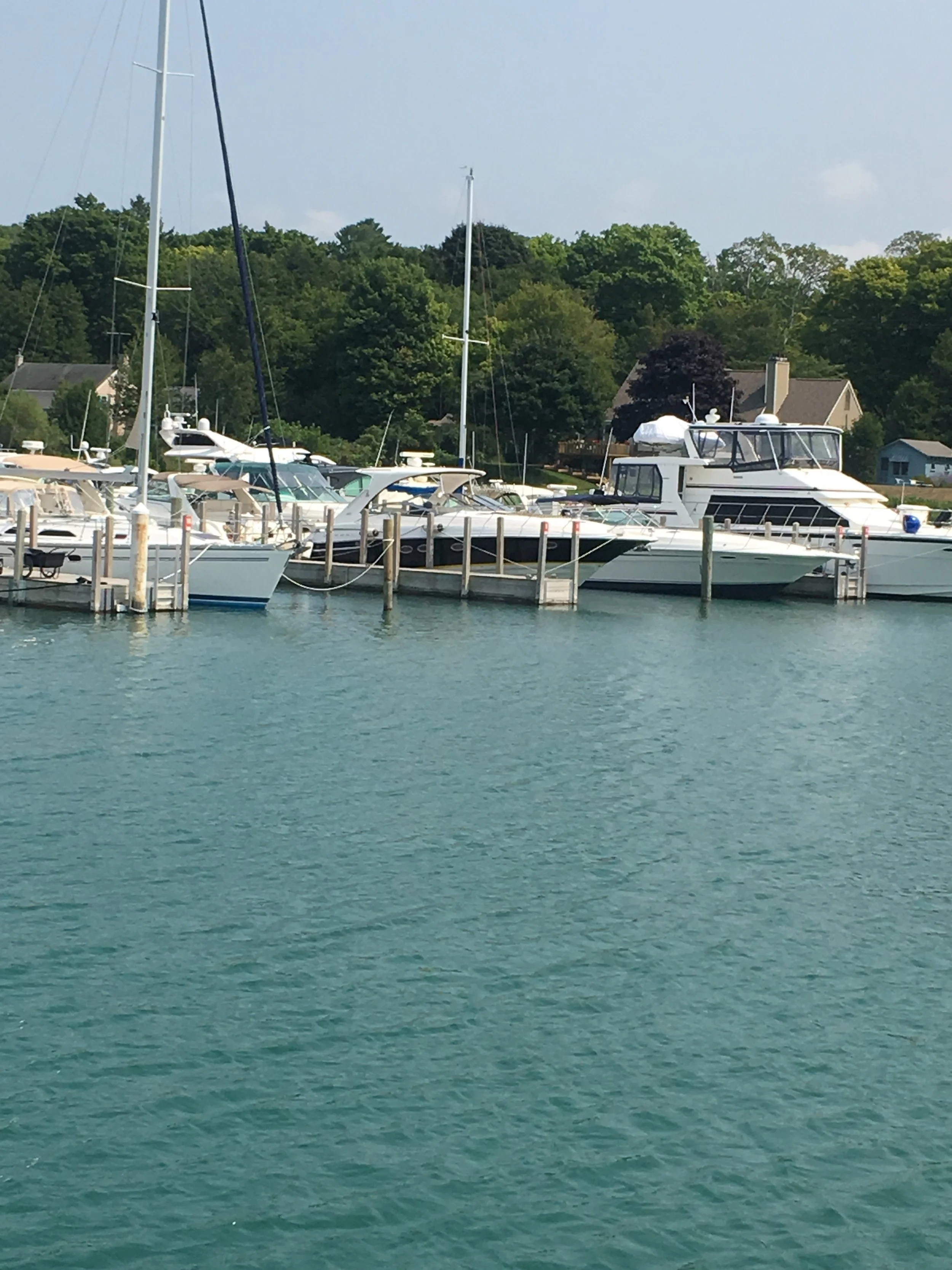 We were able to secure a slip in Leland, Michigan, so we caught the bridge opening at 10:00, and off we went for a 31 mile Lake Michigan tour. The weather was overcast and the waves were a bit lumpy, but, nevertheless, we enjoyed the ride and finished listening to a Steven King audiobook that we started back in Virginia. As we got closer to our destination, the sun came out, the sweatshirts came off, and we entered the most gorgeous waters I think we’ve seen since the Gulf of Mexico. Lake Michigan is beautiful!