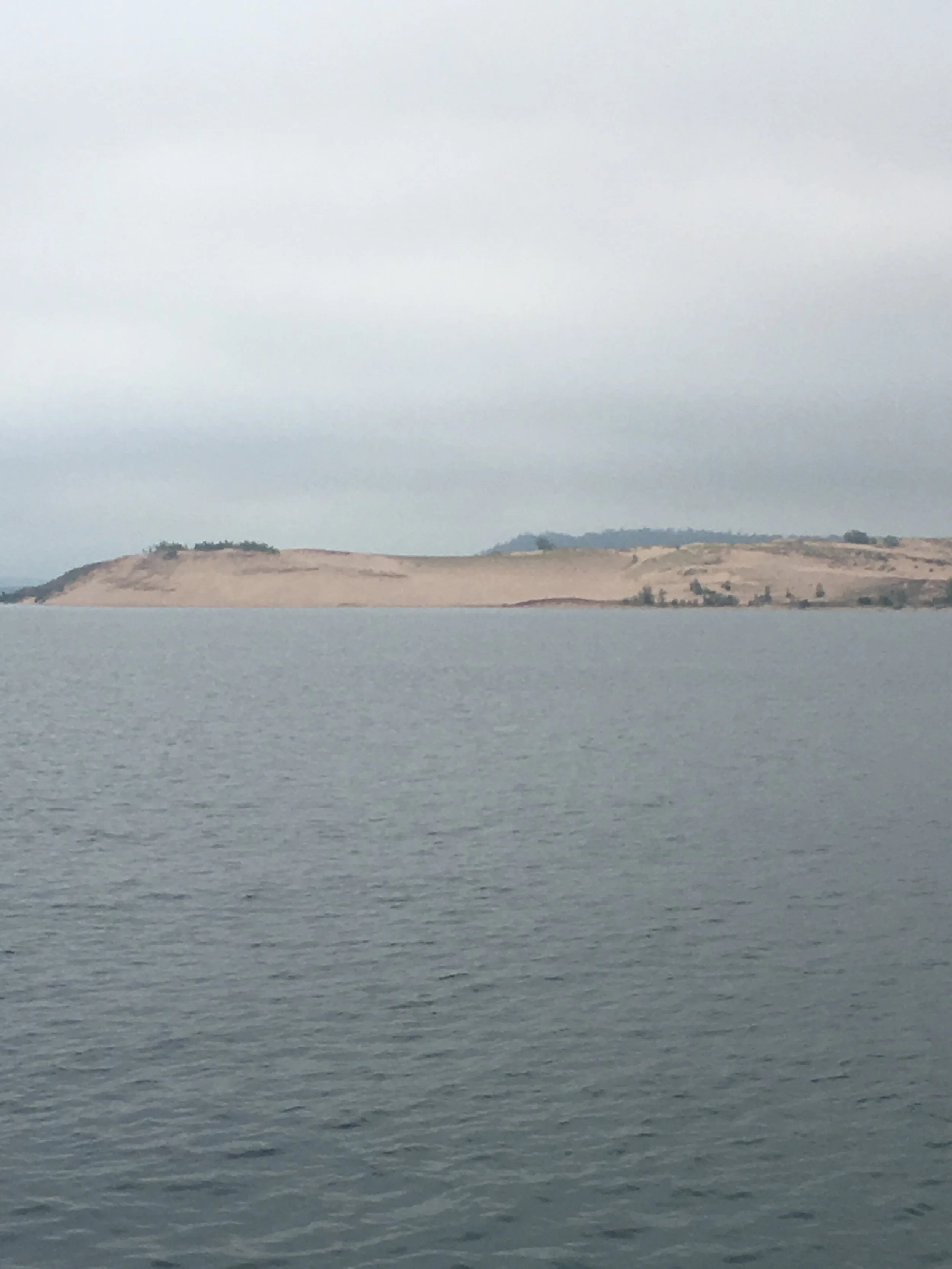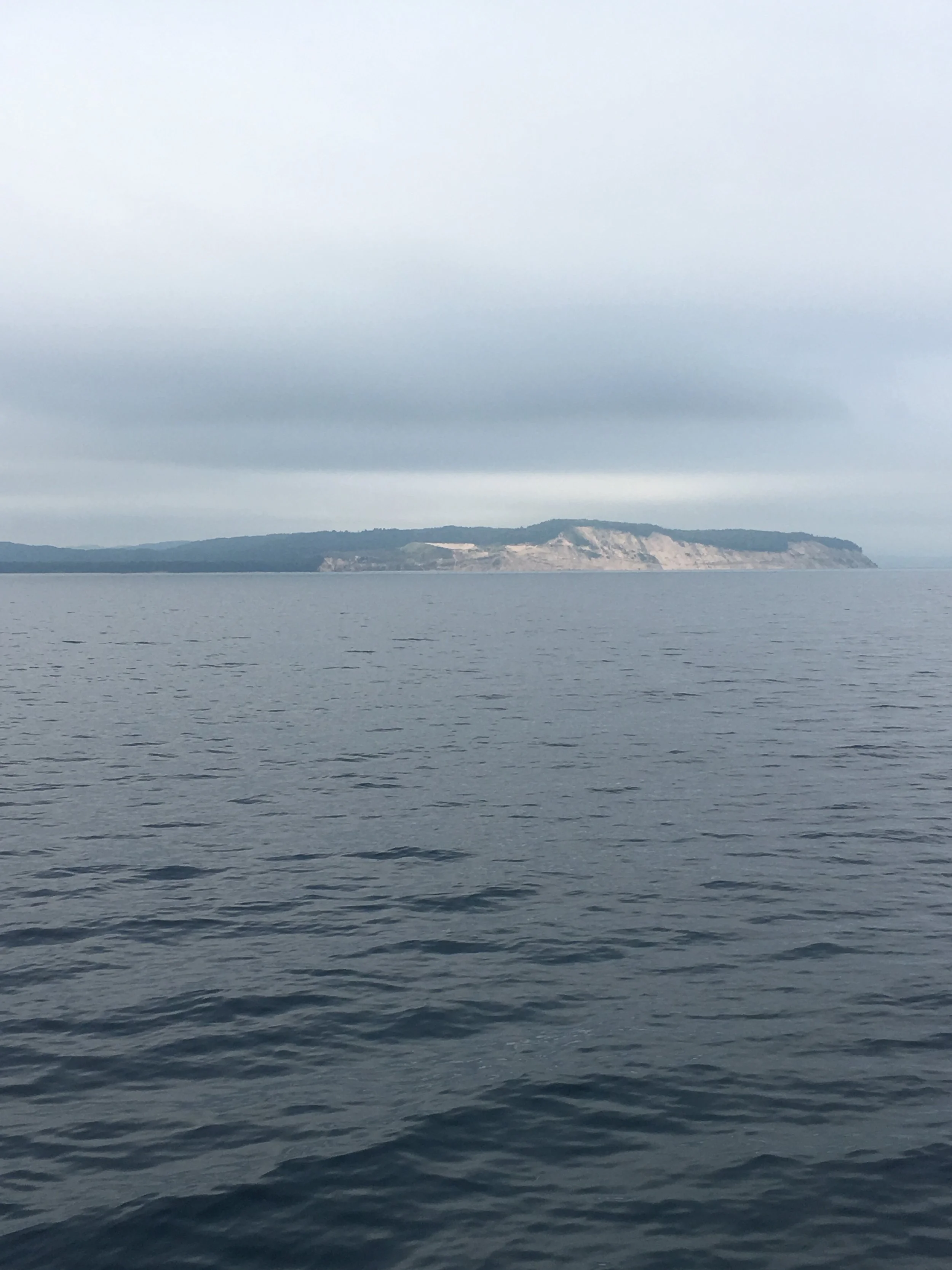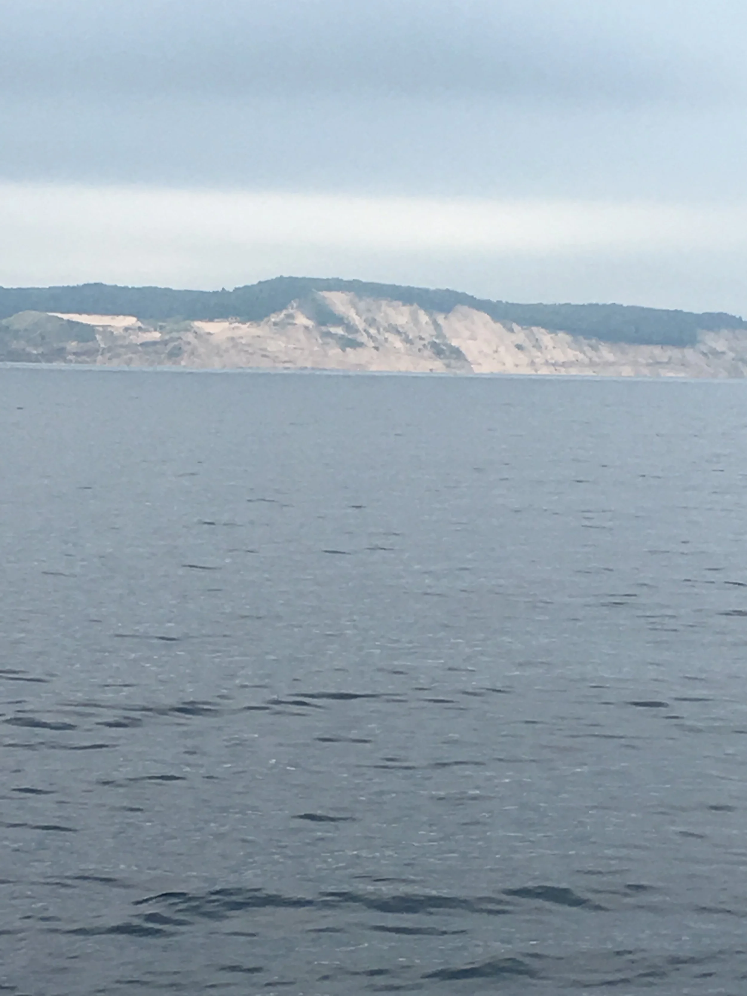 We passed a pretty cool area today. Sleeping Bear Dunes National Park. Miles of sand beach, and bluffs that tower 450 feet above Lake Michigan. This would be a place I’d like to investigate more thoroughly. From the water, with binoculars, I could see people on the beach, and a few people on a steep sand dune going down towards the water. I read about this place, and found out that once you make your way down the dunes, it can take up to two hours to climb back up the sand dunes. I don’t know about all that, but it was pretty through very overcast skies.