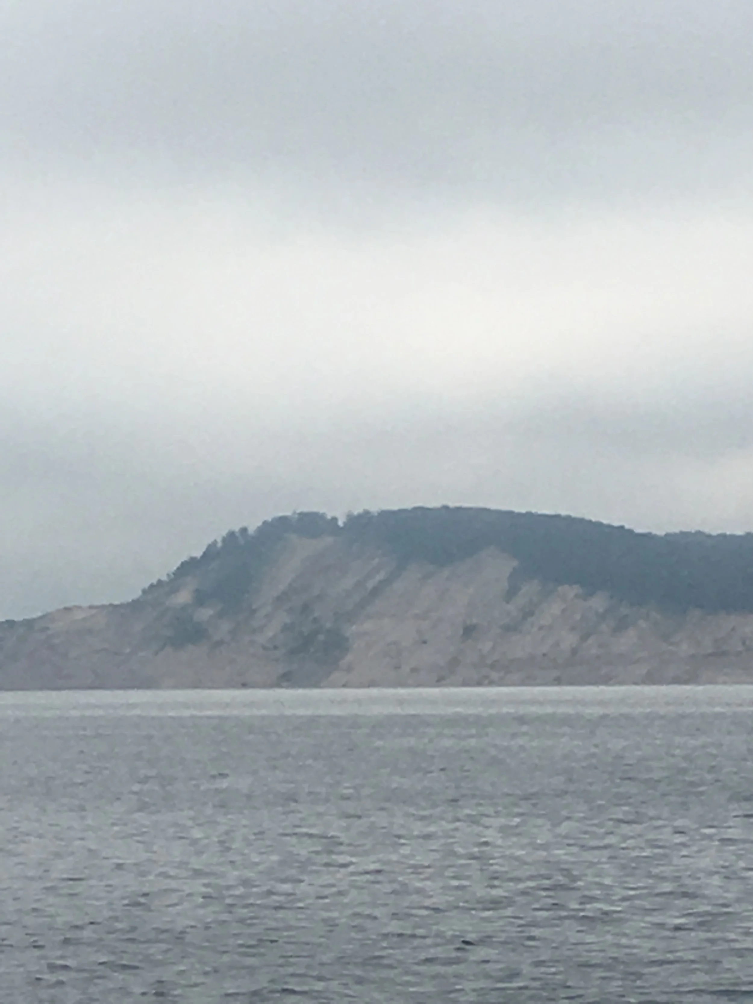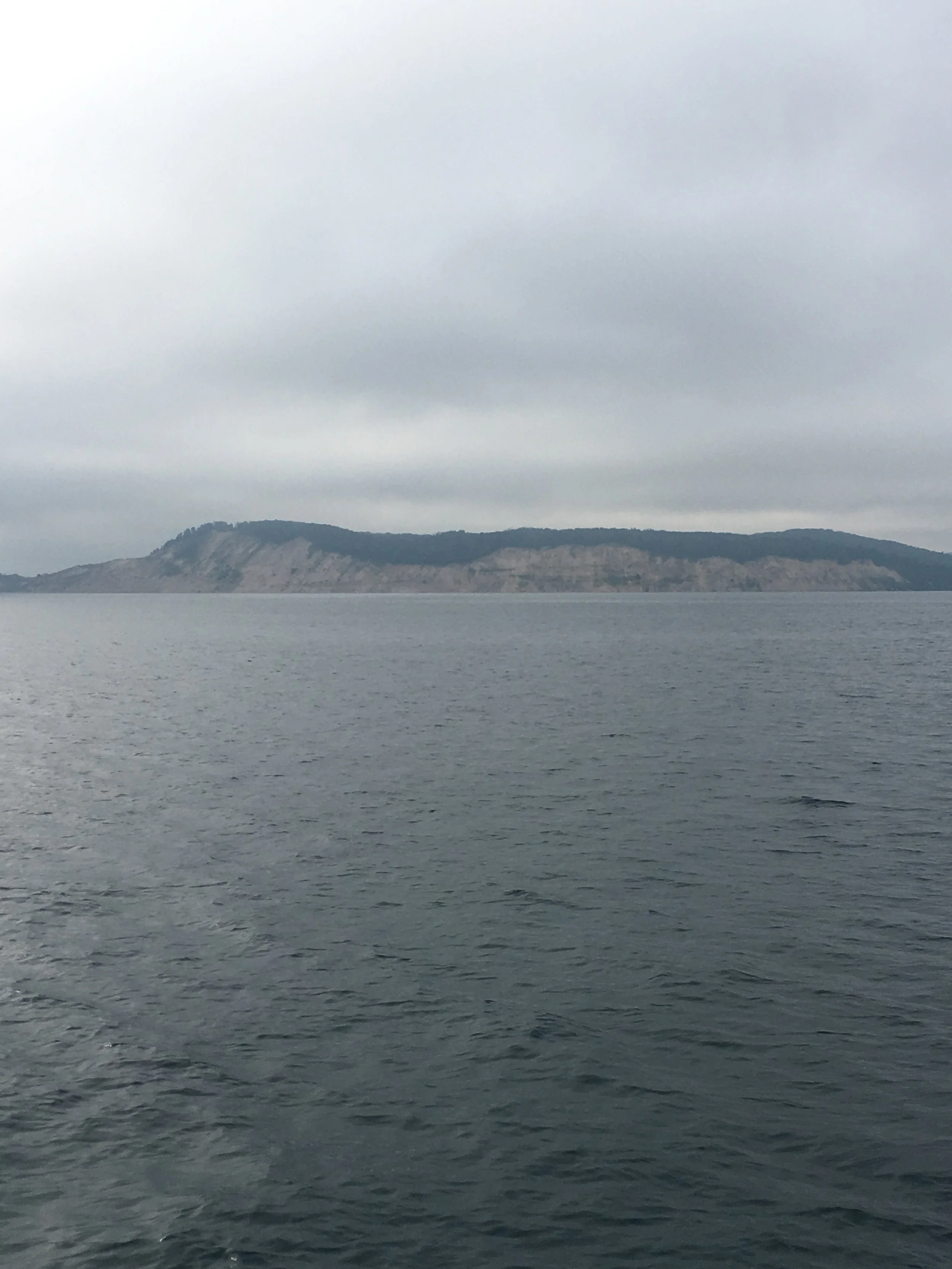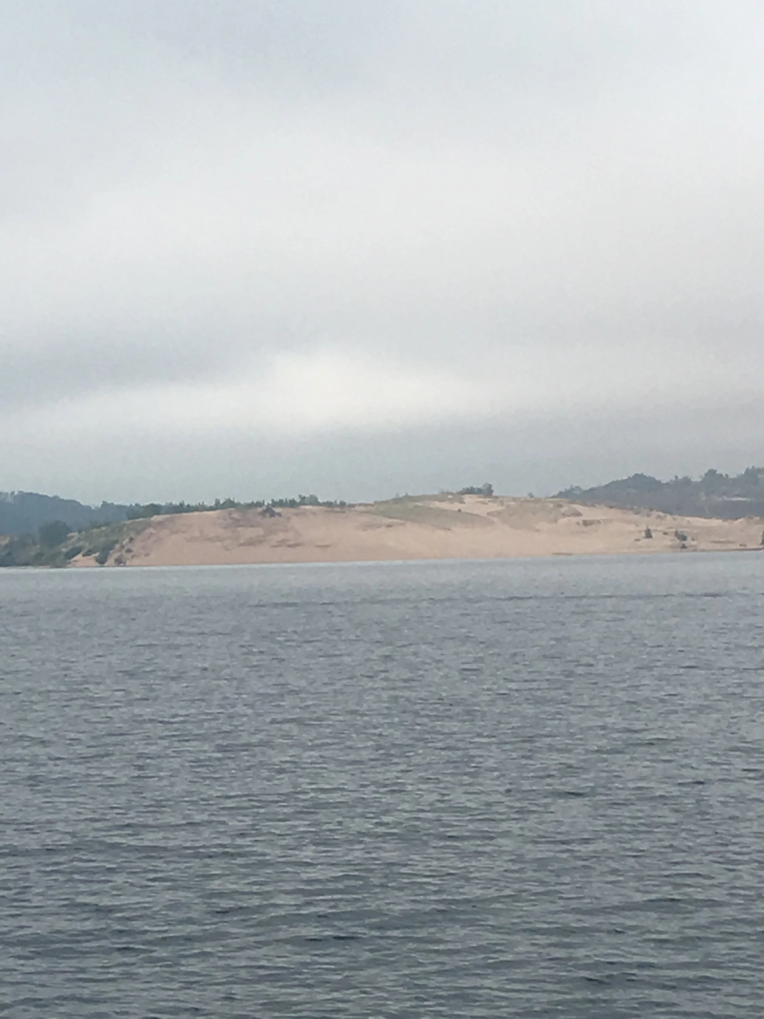We passed a pretty cool area today. Sleeping Bear Dunes National Park. Miles of sand beach, and bluffs that tower 450 feet above Lake Michigan. This would be a place I’d like to investigate more thoroughly. From the water, with binoculars, I could see people on the beach, and a few people on a steep sand dune going down towards the water. I read about this place, and found out that once you make your way down the dunes, it can take up to two hours to climb back up the sand dunes. I don’t know about all that, but it was pretty through very overcast skies.